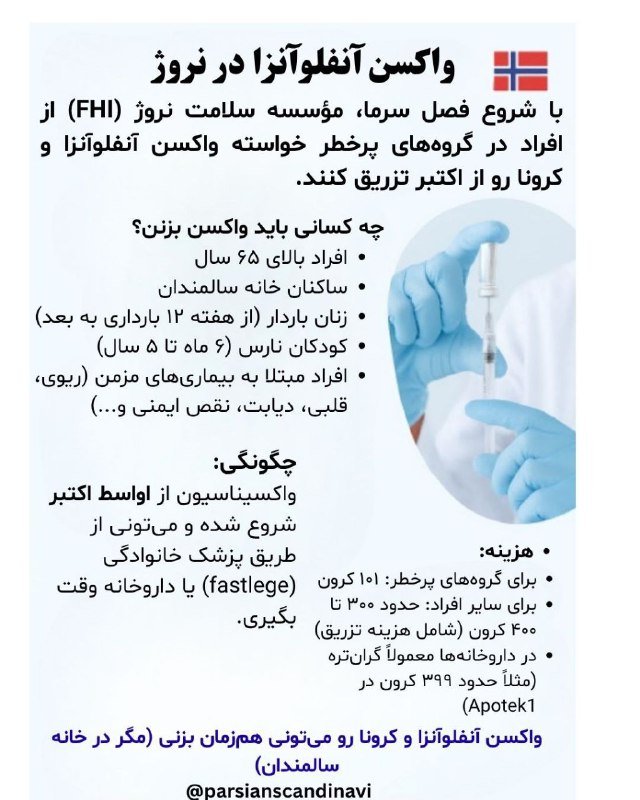 📢 راهنمای واکسیناسیون آنفلوآنزا و کرونا در نروژ 🇳🇴