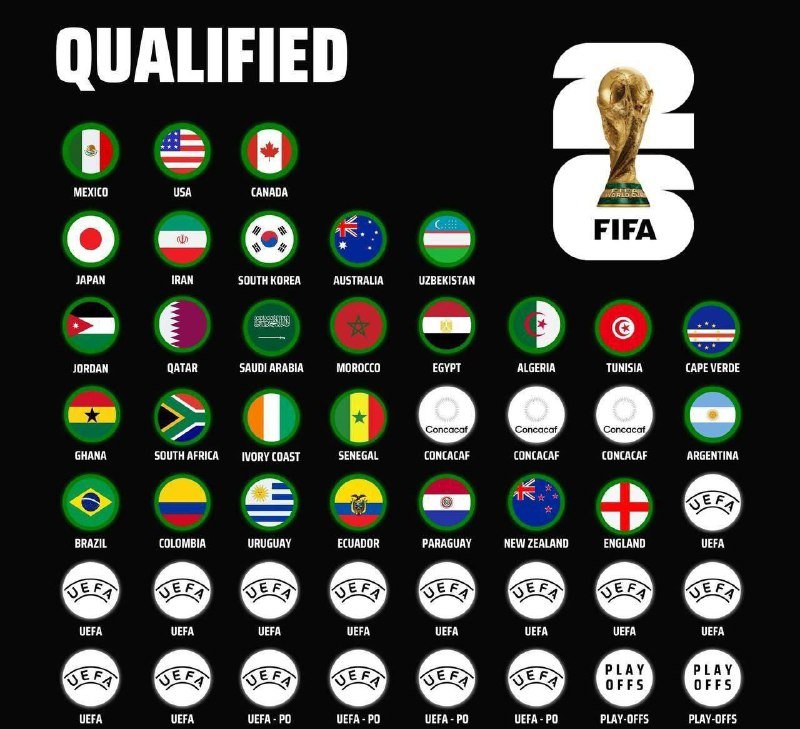🔻تاکنون ۲۸ تیم راه‌یافته به جام جهانی ۲۰۲۶ مشخص شده‌اند.