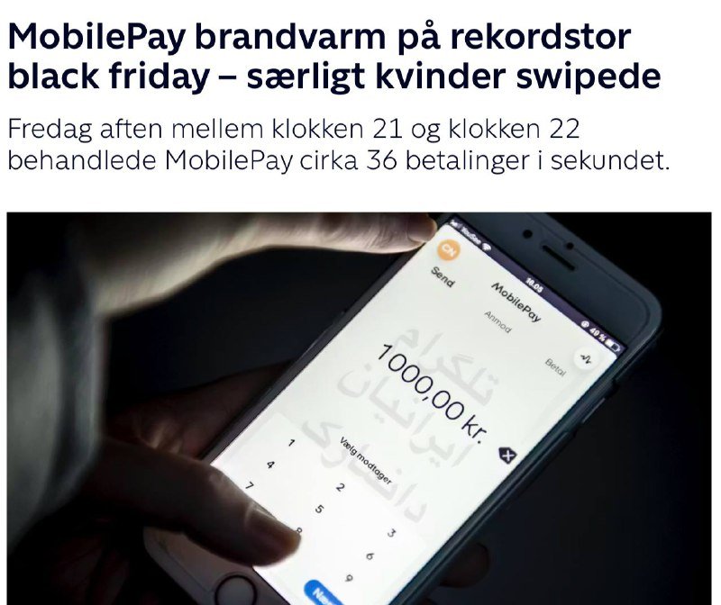 اپلیکیشن MobilePay، که حدود ۴.۶ میلیون کاربر در دانمارک دارد، اعلام کرد که بلک‌فرایدی امسال با ثبت رکوردی تازه، از سال گذشته پیشی گرفته است. بر اساس آمار منتشرشده، مجموع خریدهای انجام‌شده از طریق اپلیکیشن به ۱.۲۱ میلیارد کرون رسید؛ رقمی که نسبت به سال قبل دو درصد رشد نشان می‌دهد.