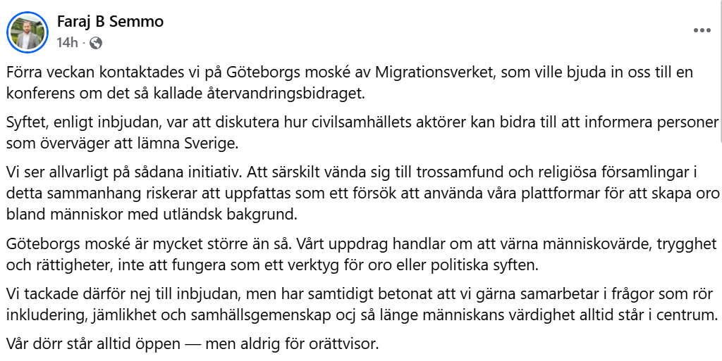 مسجد گوتبورگ دعوت آژانس مهاجرت سوئد را برای شرکت در کنفرانسی در مورد ترویج بازگشت داوطلبانه رد کرد، زیرا چنین اقداماتی ممکن است باعث ایجاد نگرانی در بین افراد با پیشینه خارجی شود.